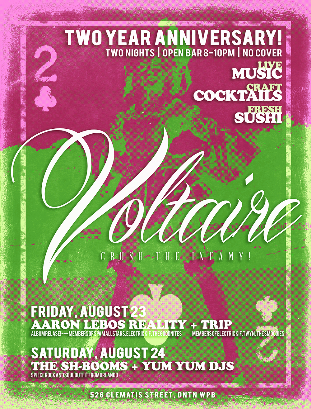 Aaron Lebos Reality perform with Trip for Voltaire’s 2 Year Anniversary! 8pm Friday August 23 in West Palm Beach. OPEN BAR 8-10, FREE TICKETS HERE! ~ Freddie Zandt