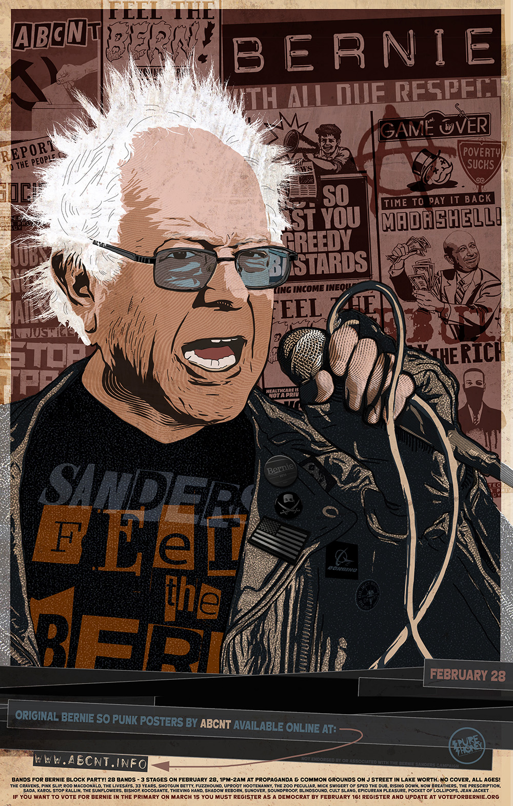 ABCNT is an LA-based street/sticker artist, DJ and political activist. After reading Vice’s article concerning the connections between Sanders’ and Burlington’s beloved punk/youth club 242 Main, he joined the unofficial visual effort to get Sanders in front of the Democratic Party with his image of the candidate, spiky-haired, leather-clad and snarling into a microphone. “Bernie has been on my radar long before he started running for president,” he explains. “He’s always been consistent as an independent. I read (the Vice article) last year and it all came together in my head that Bernie’s the lead singer of a punk band.”