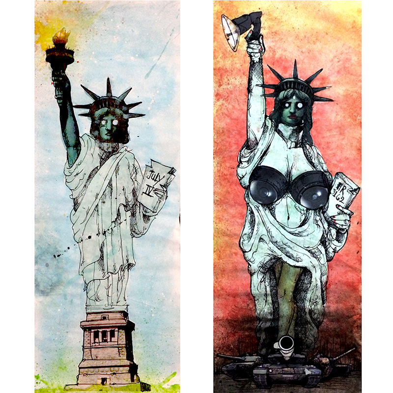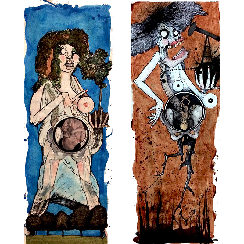 His work is influenced by the greats such as Ralph Steadman, Hieronymus Bosch, Jean-Michel Basquiat, Marcel Duchamp, Henri Toulouse-Lautrec, Salvador Dali, Jacques Louis David and Picasso. “I try to portray issues in a way that is stretched so far beyond reality that we arrive at some level of truth that otherwise gets missed,” he says. “I don’t think you can see things for what they really are until they’re brought to such an extreme version of themselves that you have no choice but to face them. That is what I’m trying to achieve in my work.”