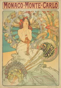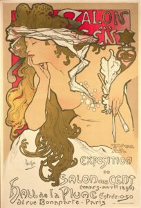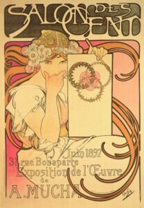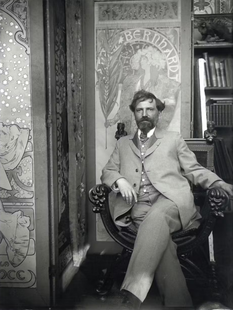 Mucha’s breakthrough came in Paris in 1894 with a commission for a poster promoting the French stage actress Sarah Bernhardt in the world premiere of the play Gismonda. The artwork became a sensation and spurred a long-running partnership: she as his muse, and he as the artist who could capture the mystique and magnetic stage presence of “Divine Sarah,” as Bernhardt was known. People today barely remember the play, but they know the poster of Bernhardt as the title character wreathed in runic lettering and a floral crown.