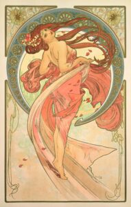 Mucha’s posters blended lush designs with flowing natural forms, often featuring a nymph-like woman as the central figure, framed by a decorative border, splashes of flowers and a prominent circular outline that evokes a halo. Placing his subject asymmetrically in an arc or a circle was the basis of his Q formula. The women were undeniably feminine — dreamy eyes, cascading hair, cheeks suffused with color, symbols of sensuality and self-possession. The popularity of his illustrations proved that art could be both aesthetically pleasing and widely accessible.