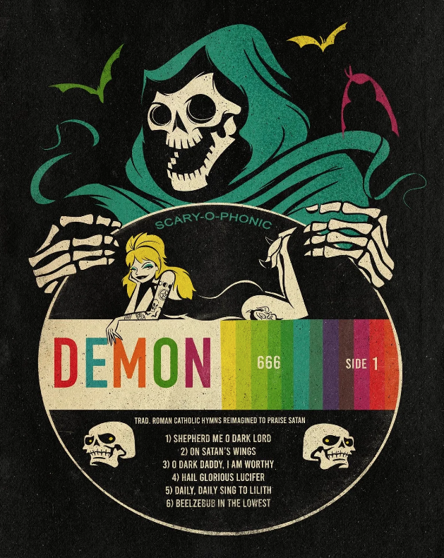 Asked what he’s inspired by — fire up your search engines — James drops references deeper than Elvira’s neckline: ’40s jazz album covers designed by Jim Flora; the midcentury cartoon canon of Hanna-Barbera, the output of the UPA animation studio that created Mr. Magoo. All these, and many more, provide a wealth of line and color influences that James incorporates into his very stylized, often duotone pieces. Add his fondness for horror hosts (Vampira, John Zacherle) and William Castle movies (“The Tingler,” “House on Haunted Hill”), and James is producing somehow familiar but one-of-a-kind work.