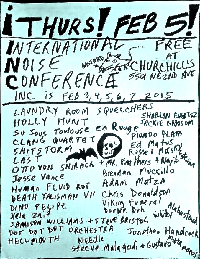 inc_33The International Noise Conference (INC) – Frank “Rat Bastard” Falestra’s annual experimental noise freak fête – returns to Churchill’s Pub in Miami for the dirty-dozenth time on February 3 for a five day-run of chromosome-crushing volume, lewd do-it-yourself costumes and far more than enough raunchy performance art to make middle America take a big, gasping collective crap in its pants (which some INC artists may enthusiastically use to coat themselves on stage).