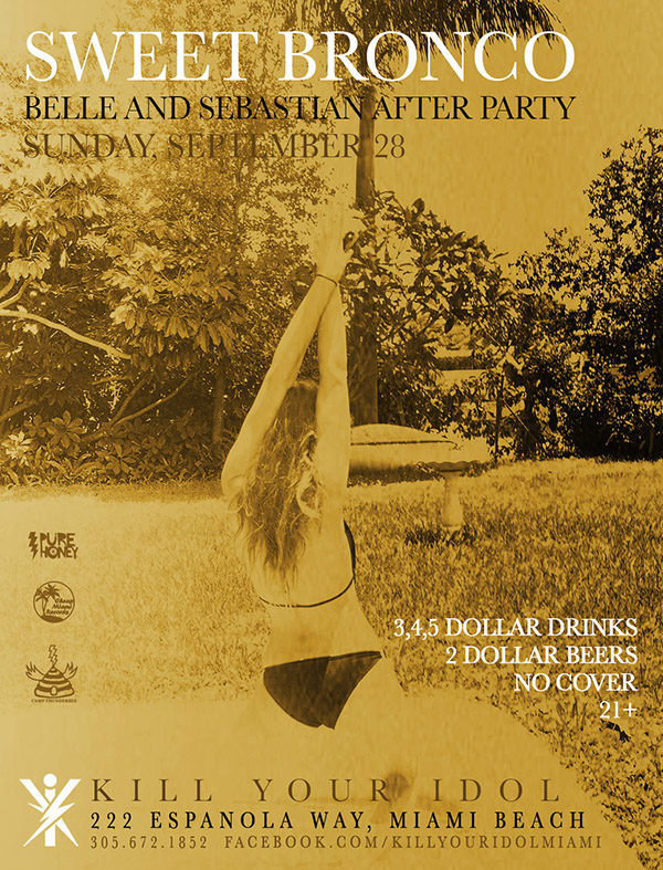 And did I mention they’re a wonderful live act? Incidentally, Belle & Sebastian is the first band I ever drove out of Florida to see, at a sold-out show in Atlanta in 2002. Now, finally, we don’t have to travel as far, with a supremely rare SoFla gig on Sept. 28 at the Fillmore, 1700 Washington Ave., Miami Beach. Tickets cost $32.50, get them while you can. Call 305-673-7300 or visit livenation.com. After Party at Kill Your Idol w. Sweet Bronco.