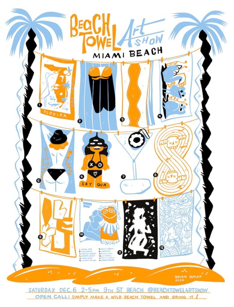 The second Beach Towel Art Show happens 2-5pm Saturday, December 6 at the 9th Street Beach in Miami Beach. Visit Brian Butler at theupperhandart.com ~ Kelli Bodle