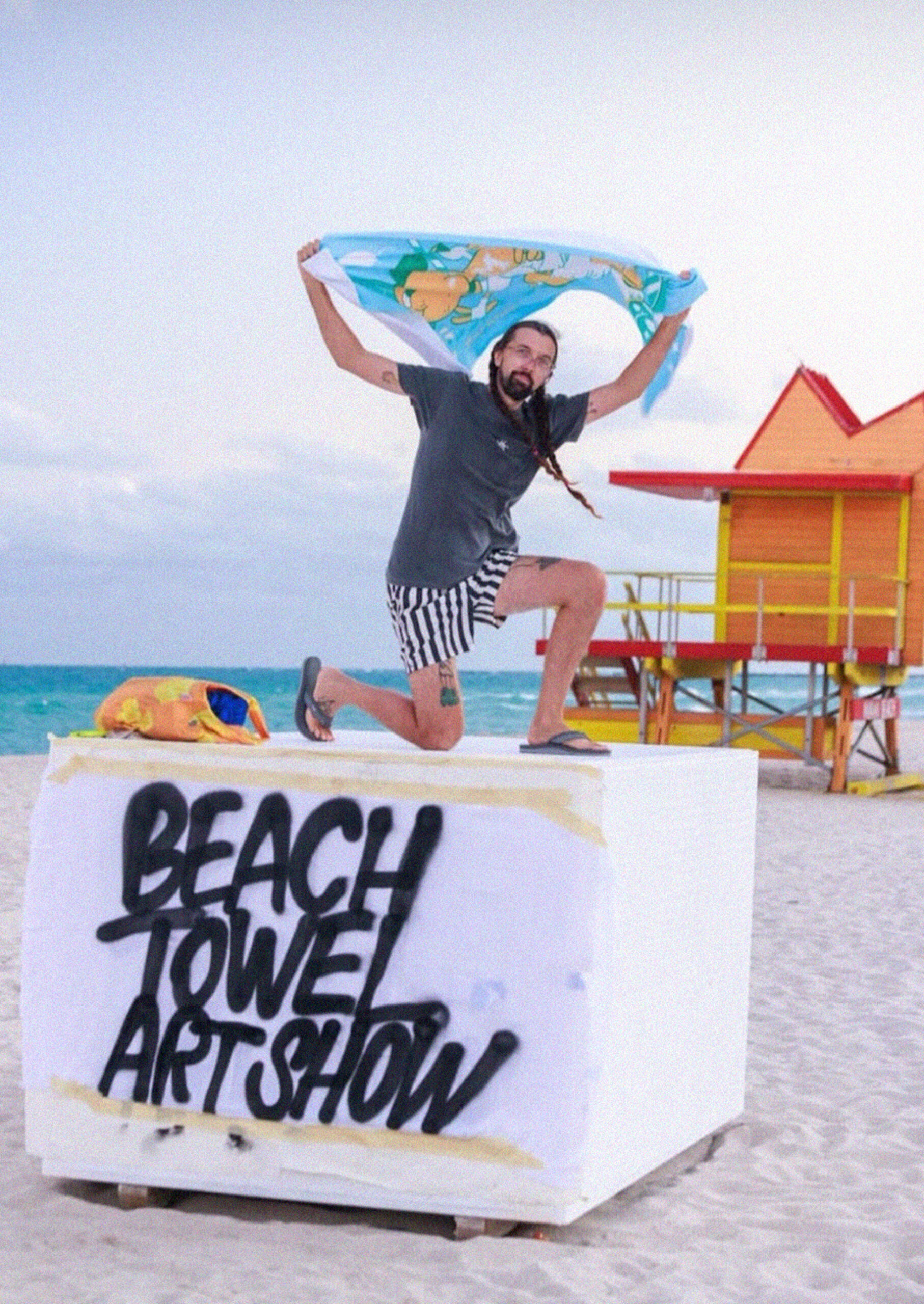 The beach towel exhibition won’t be the only draw on December 6. “The first beach art show was a conglomeration of all the different Miami creatives, nodes working in unison,” Butler says. “Dale Zine Shop made frisbees for people to play with on the beach. Raw Figs brought a roll of backdrop paper, and people were jumping in the water and then rolling around or doing footprint art.”