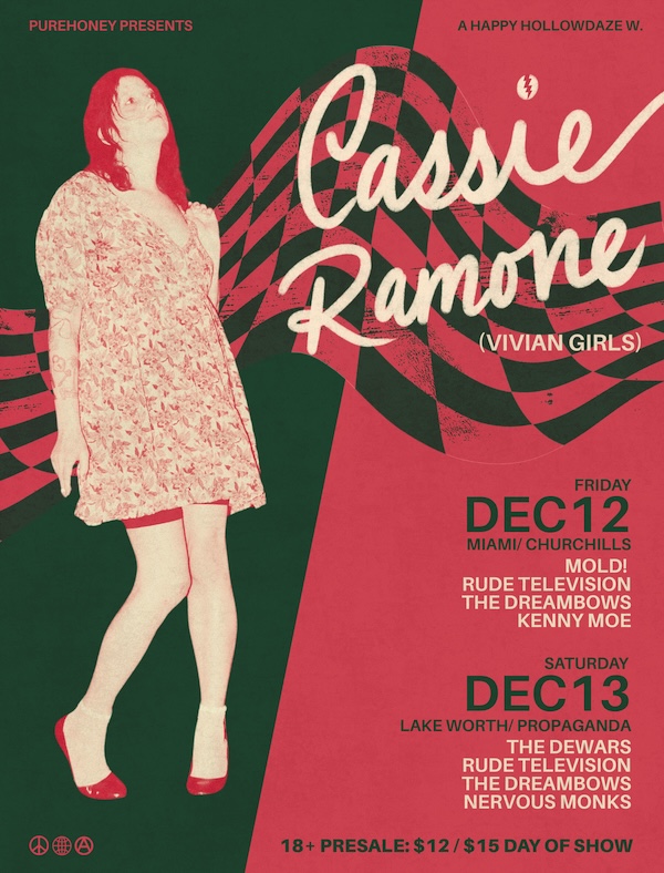 PureHoney presents a Happy HollowDaze weekend w Cassie Ramone, 8pm Friday December 12 at Churchill’s Pub in Miami and 8pm Saturday December 13 at Propaganda in Lake Worth. Rude Television and The Dreambows open both shows, with MOLD! and Kenny Moe at Churchill’s, and the The Dewars and Nervous Monks at Propaganda. cassieramone.com ~ Erik Kvarnberg