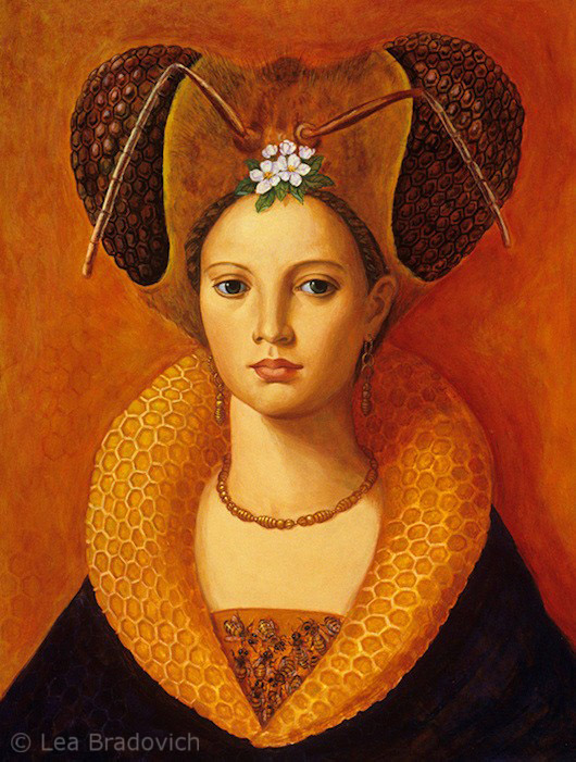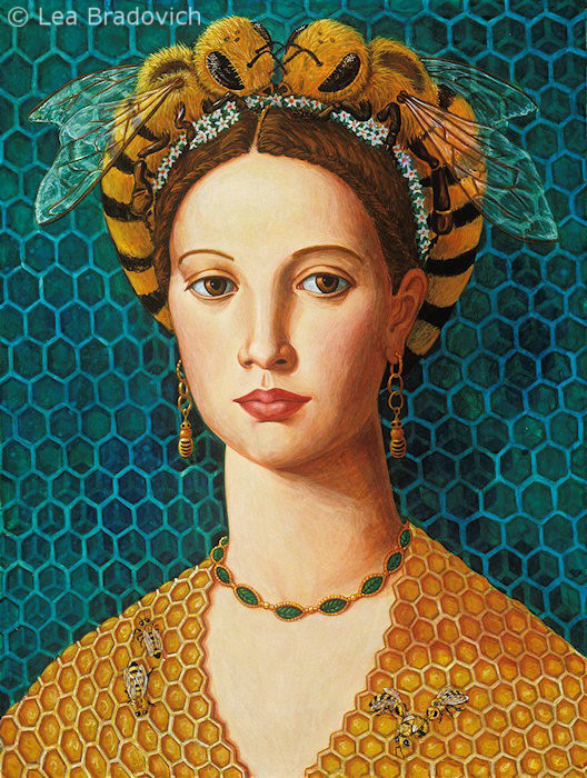 “All of my bee paintings merge honey (nectar to the ancients), bees and flowers, (in Daughter of the Hive’s case apple blossoms.) The painting takes place within a honeycombed hive in an amber light. The bees were considered holy messengers in many cultures, bridging the divine and mundane worlds. The buzzing of the bees was considered the sound of the Goddess. Daughter has a honeycomb halo, referring to the bees holy function. If the whole is holy, the bees make our world whole, without them we would have no flowering plants. In this sense we are all sons and daughters of the hive. The smaller scale world of the bees and other insects is happening in our backyards where great adventures and epic migrations begin and end. A simple safari is to wander around the plants and soil and simply open our eyes!”