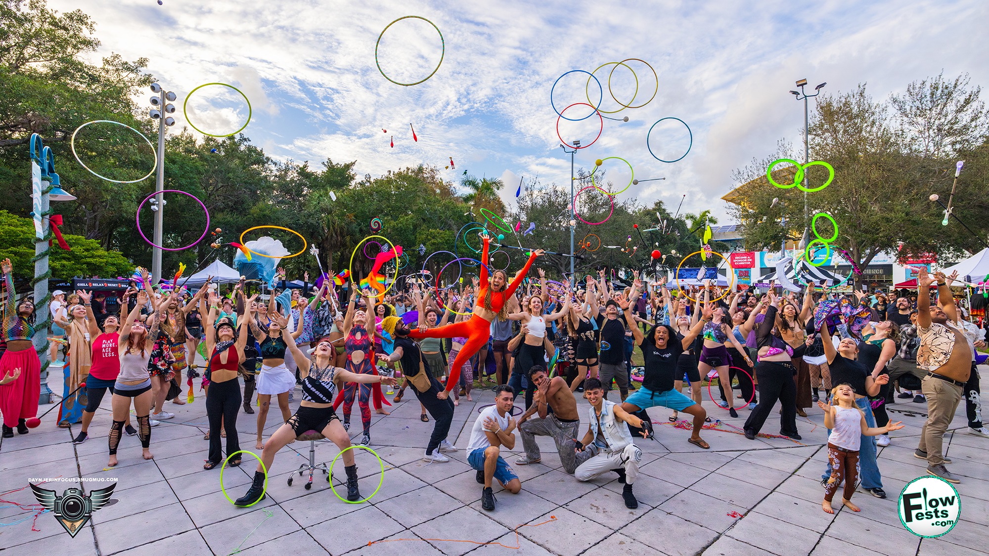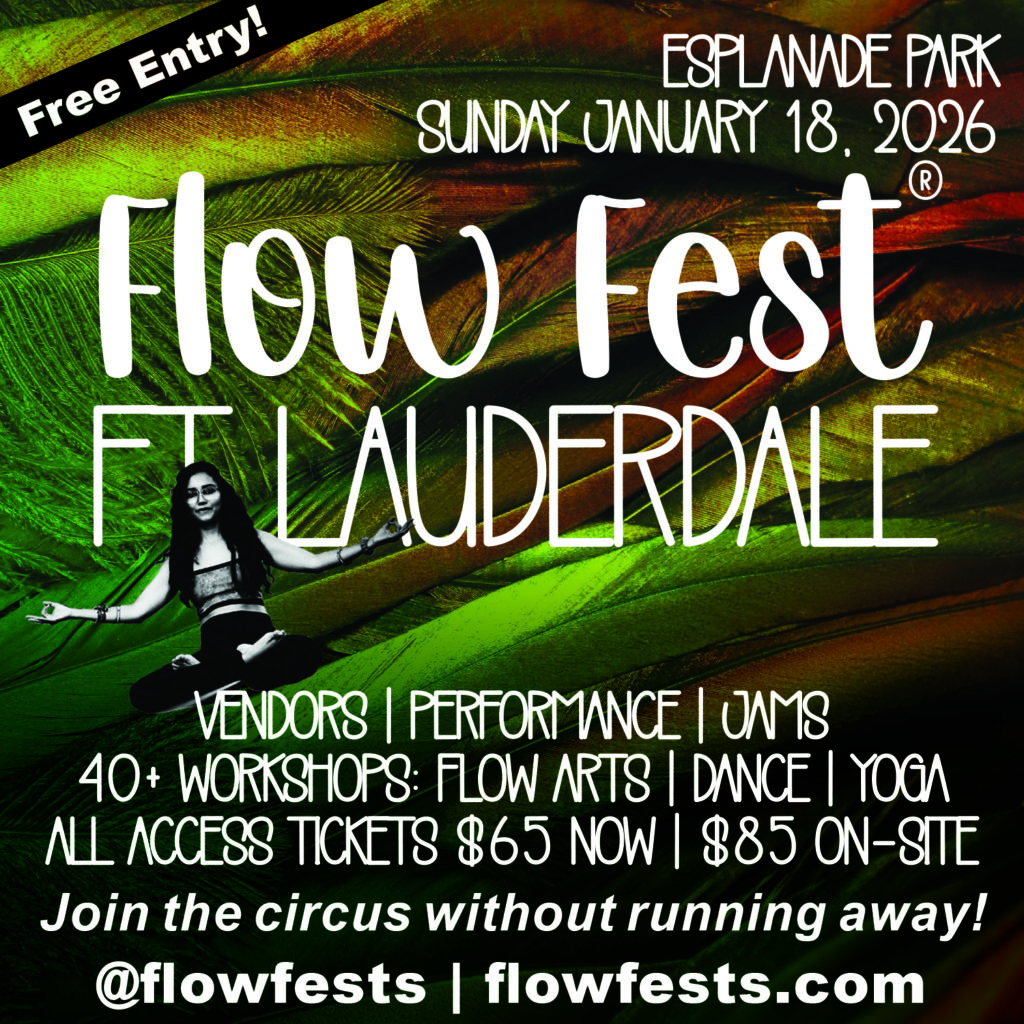 Flow Fest Ft. Lauderdale, returning to Esplanade Park, transforms this idea into a living, participatory experience. The free-admission daylong festival gathers dancers, yogis, flow artists, musicians, vendors, and curious newcomers into an environment that explores how movement, play, and community shape the human spirit. With workshops in flow arts, dance, and yoga — alongside fire-spinning gatherings, professional development sessions, live music, and immersive jams — Flow Fest becomes a pop-up village devoted to creativity and embodied presence. It’s also designed for all levels of experience, welcoming complete beginners alongside seasoned artists in an atmosphere that values curiosity over perfection.