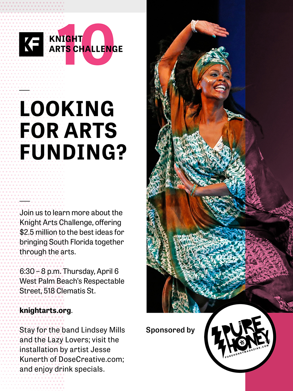 The Knight Arts Challenge Community Conversation, sponsored by PureHoney, runs 6:30pm to 8pm on April 6 at Respectable Street in West Palm Beach. Lindsey Mills and the Lazy Lovers perform afterwards. Digital Art demo by Jesse Kunerth of DoseCreative.com Visit https://www.knightfoundation.org.