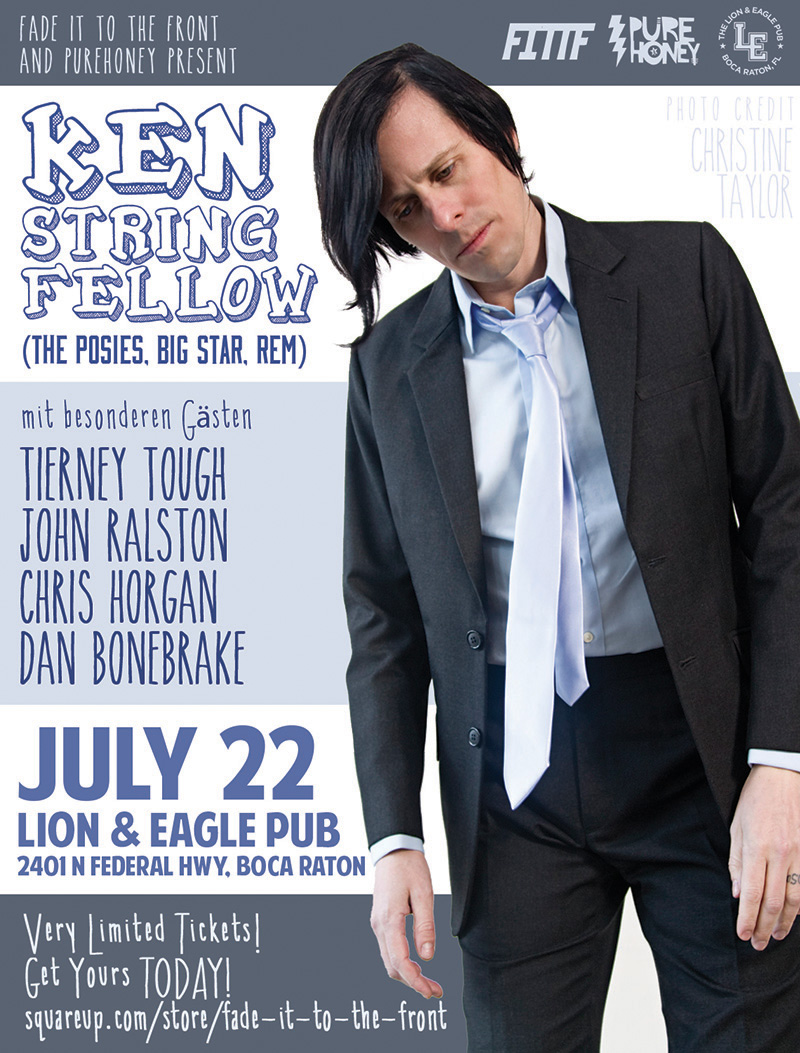 PureHoney and Fade It To The Front present Ken Stringfellow July 22 with Tierney Tough, John Ralston, Dan Bonebrake and Chris Horgan at Lion & Eagle PubLion & Eagle Pub. 2401 N Federal Hwy, Boca Raton, Florida 33431, doors 7pm. Very intimate venue. Tickets are very limited. It’s highly suggested you purchase in advance. GET TICKETS! RSVP