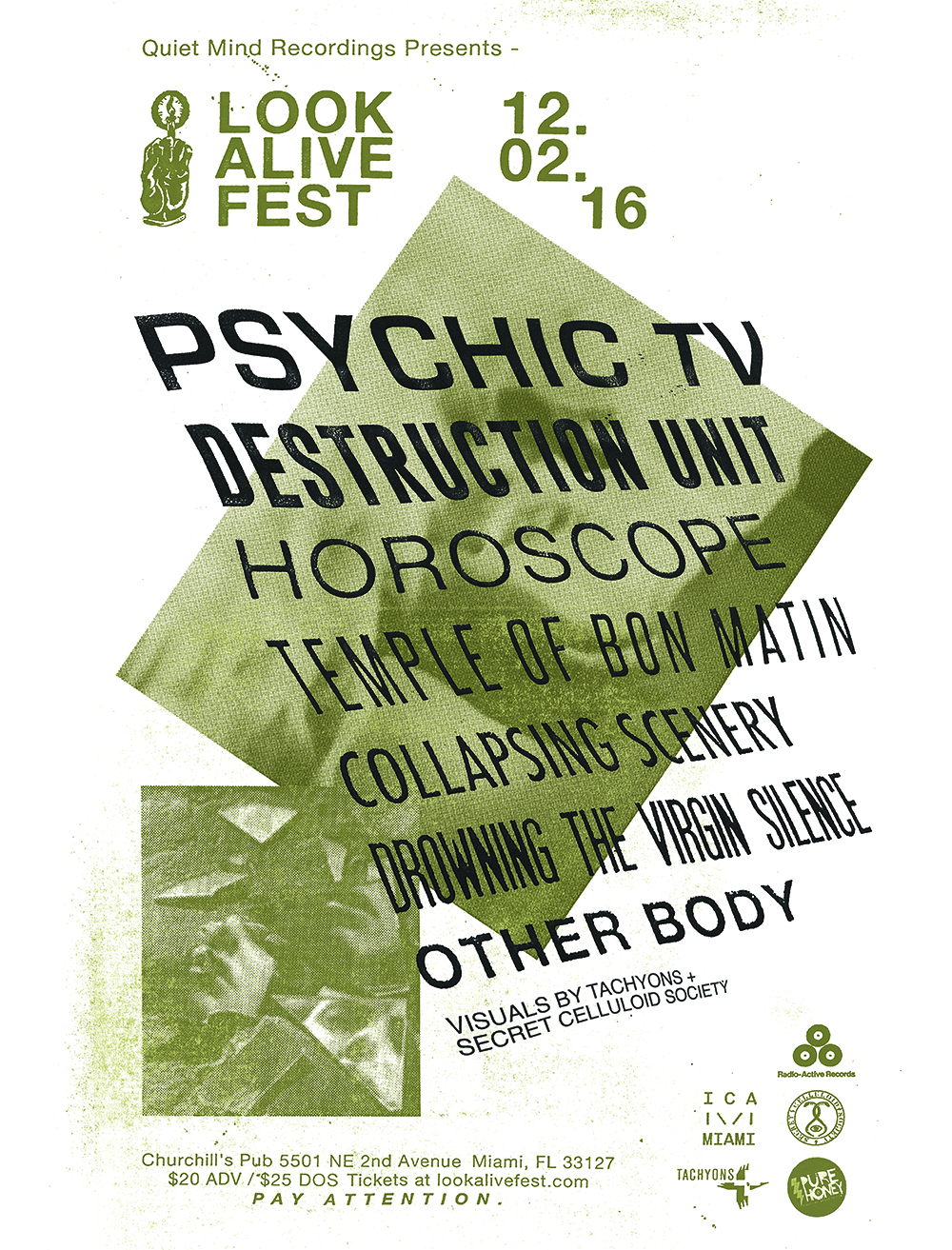 Look Alive Fest 2016 featuring Psychic TV and Destruction Unit 18+ at 8pm on Friday, December 2 at Churchill’s Pub with Horoscope, Temple of Bon Matin, Collapsing Scenery, Drowning the Virgin Silence, and Other Body.Visuals by Tachyons + and Secret Celluloid Society. Advance tickets available at LOOKALIVEFEST.com | RSVP on Facebook