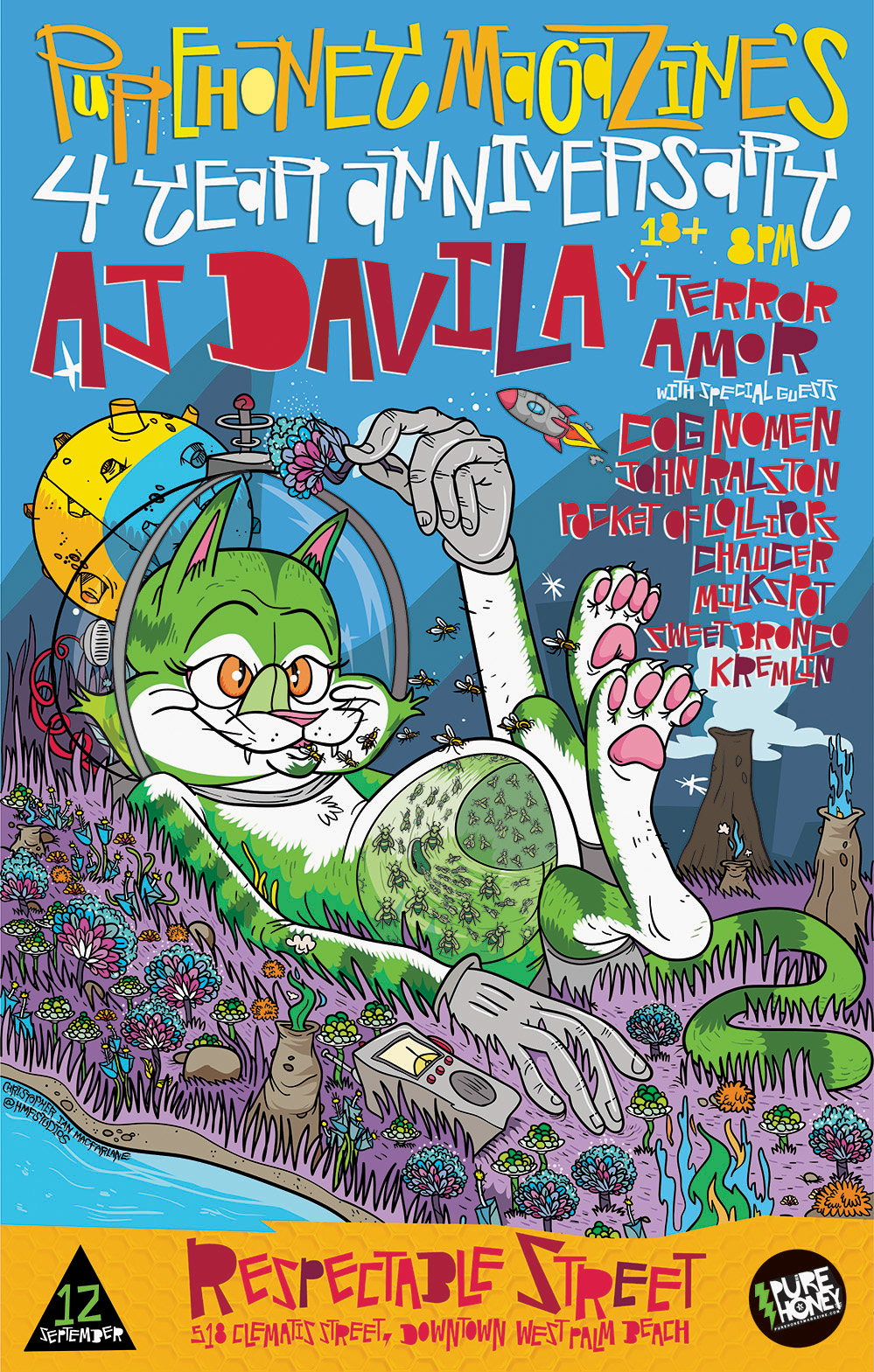 Hey there, PureHoney reader. Did you know that we as a publication are on the cusp of our 4 Year Anniversary? Pretty wild, right? Somehow, in a region that eats up and spits out alternative and independent periodicals, we’ve actually made it and remained a qualifiable source for all that is good in a variety of South Florida’s creative realms! What does that entail for you, oh loyal reader? A raucous anniversary party curated with the kinds of rad artists you’ve come to expect from us!