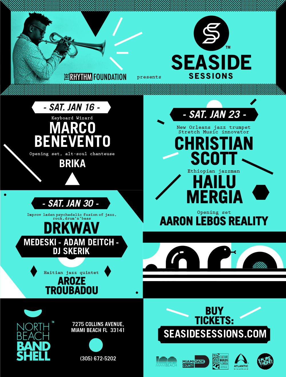 The Seaside Sessions concerts are January 16, 23 and 30 at North Beach Bandshell, 7275 Collins Avenue, Miami Beach. All shows are 7 to 11 p.m. Advance tickets are $25 per show. Gate admission is $30. A full series pass is available for $50. Children under 6 are admitted free. Visit http://www.rhythmfoundation.com/series/seaside-sessions/ or call (305) 672-5202