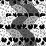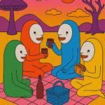 “One of my recent pieces was of the characters I draw having a picnic — all the while, look what’s actually going on around us,” Dewsnap says. “I was basically saying: We just want to feel wanted by other humans, to be nourished and be both physically and mentally comfortable. We tend to make a mess of everything and over-complicate when forgetting our basic needs.”