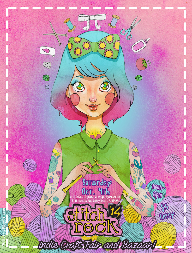 “We do most of the promo in house,” (which she clarifies means, quite literally, her own home), “but for the artwork we commission one of our favorite artists to create the artwork based on a loose concept I come up with. Every year they blow me away with the final product and I just want to plaster it everywhere!” Make sure you check out this year’s artwork by Danny Brito, a Stitch Rock family favorite. Danny was born and raised in Miami and currently lives and works from a small home/studio space in Lauderdale. He has a “small brain and a big heart”, which is reflected in the cutesy things he creates. When not drawing, he likes to command the sewing machine, go thrifting, or cuddle with his puppies. Danny is available for commissions or freelance work. Learn more: www.dannybrito.com