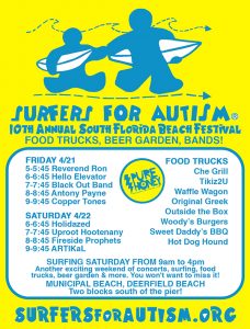 The 10th Annual Surfers for Autism Beach Festival will be held April 21-22 at Municipal Beach in Deerfield Beach. The event is free, but you can support the event by purchasing merch, or making a donation or volunteering your time. Learn more by visiting http://surfersforautism.org/. RSVP